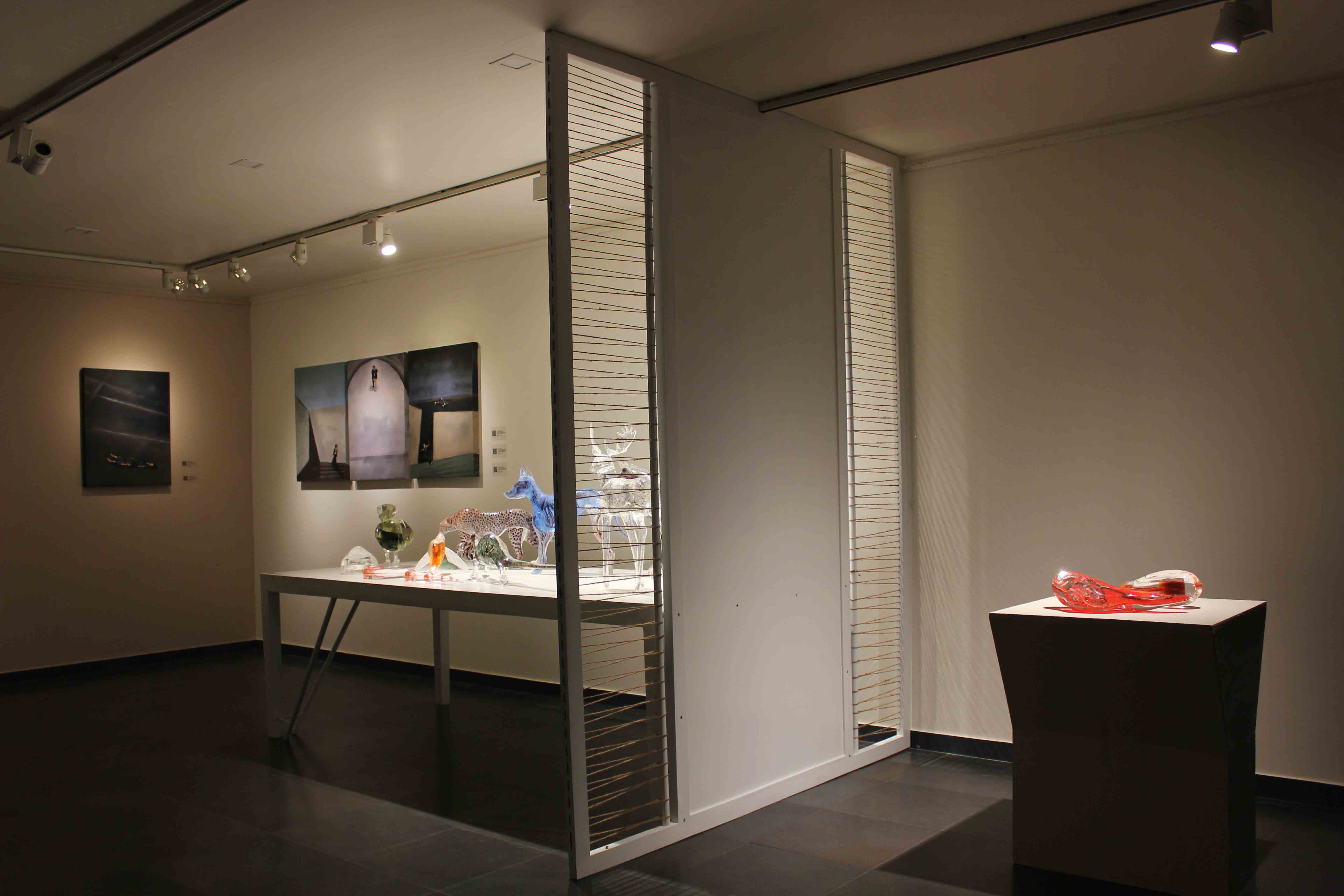 Looking into the gallery, the contrasting warm 3000K on the vertical surfaces creates an inviting atmosphere. Flexible spotlighting is surface mounted within matt black tracks, a neat solution that allows the gallery to adjust the lighting to suit the current exhibition.