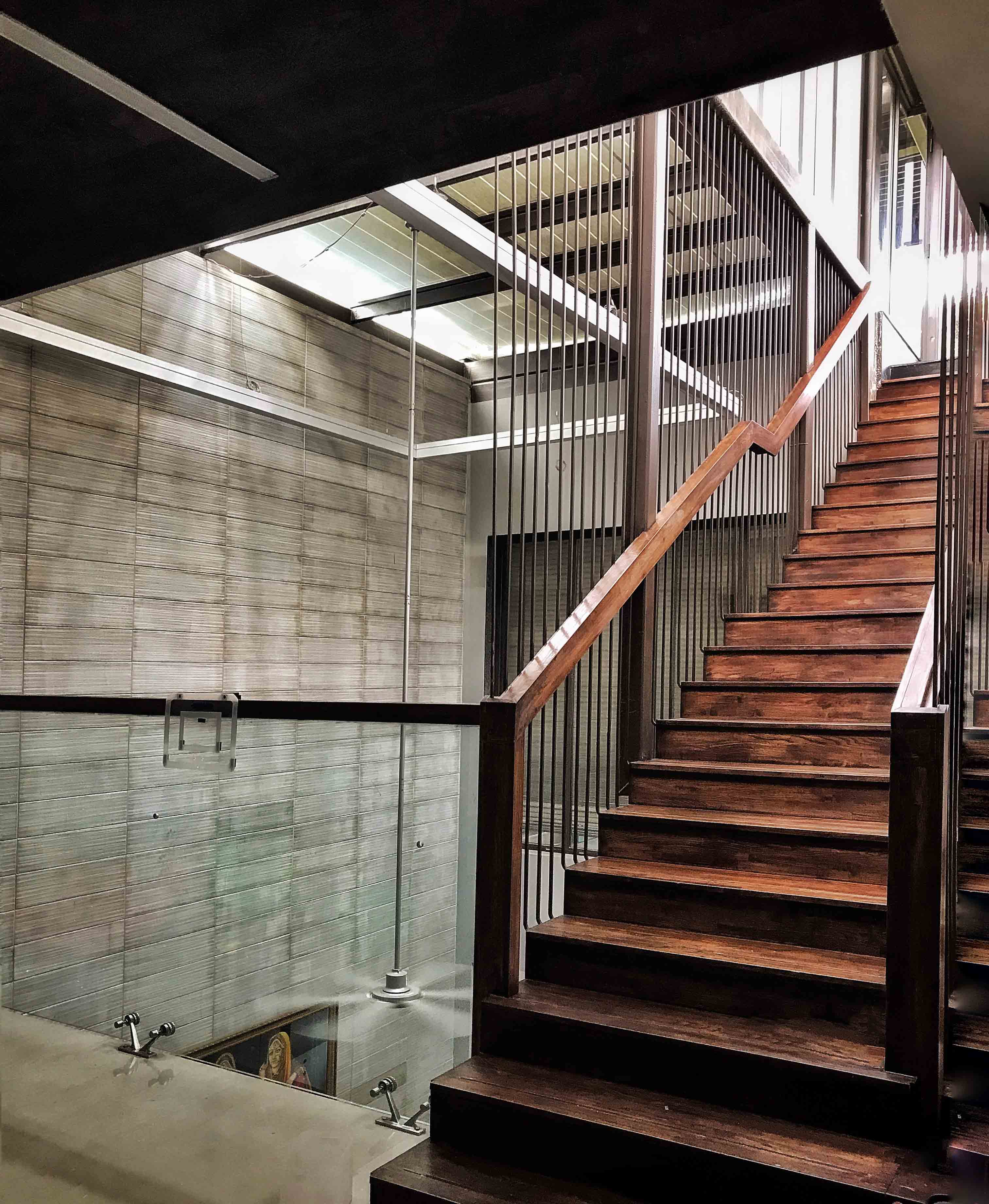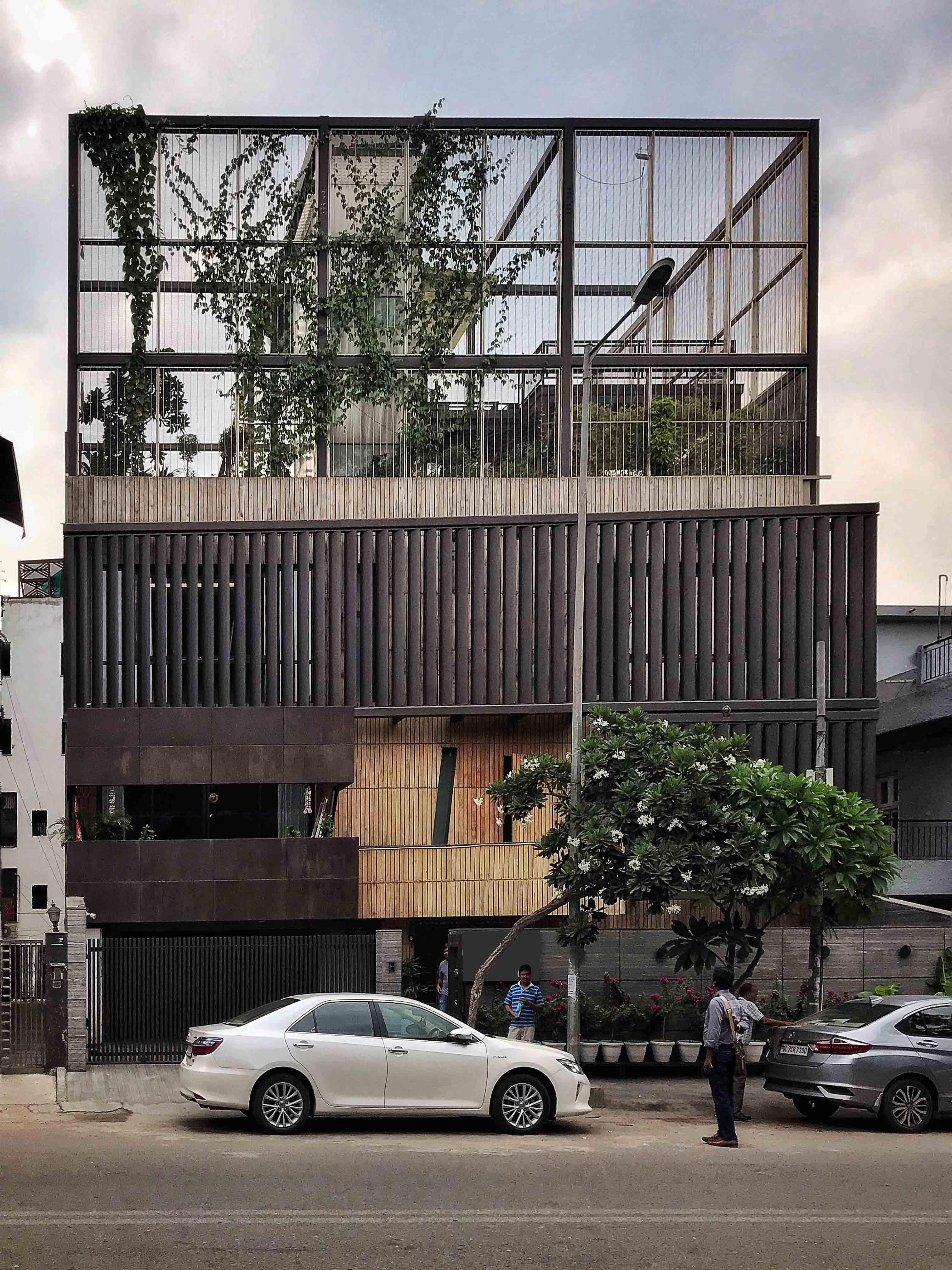 Designed by MOFA, the residence stands apart as a designed masterpiece in an otherwise mundane society of Naraina.The interior's contrast to the exterior was warm and customised to individuals using the space. A central double height space ties up the whole residence. Loaded with public function of house the central area has a free flowing form.
