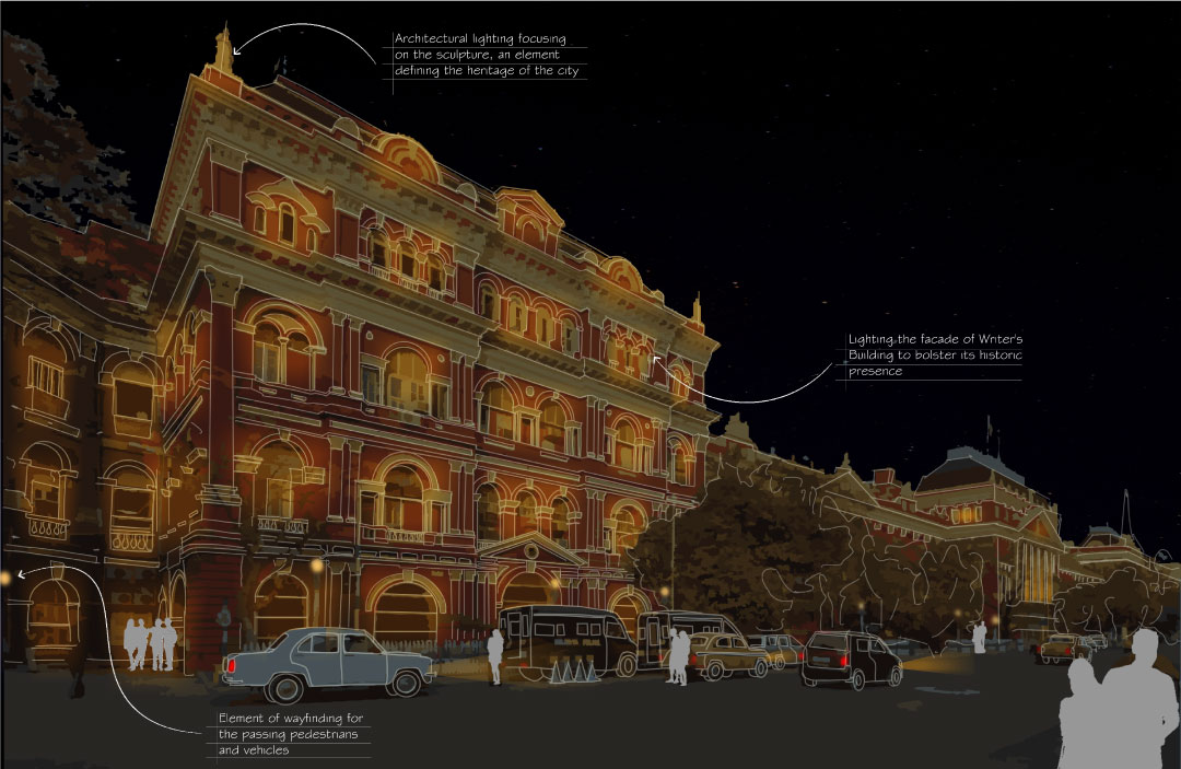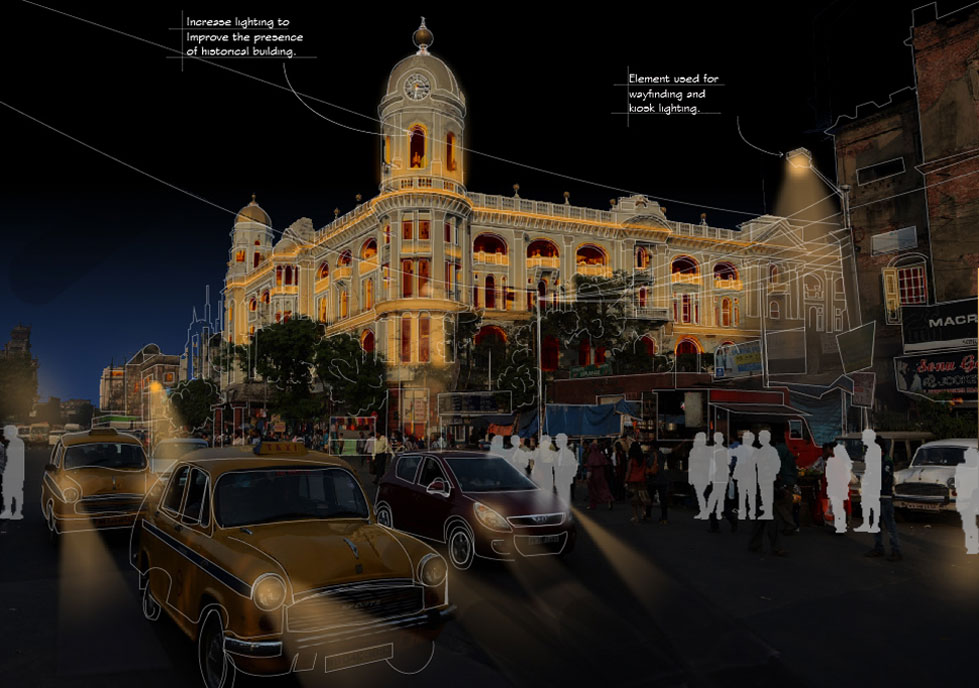 Kolkata is a city rich in culture and heritage and is an oasis for travellers with an interest in literature, history, architecture, art and cinema.However, despite having so much to offer, Kolkata has not been able to utilize its potential as a tourist destination. With the help of lighting interventions the idea of the street has been rethought after dark to push the boundaries of the city to captivate and engage the user.