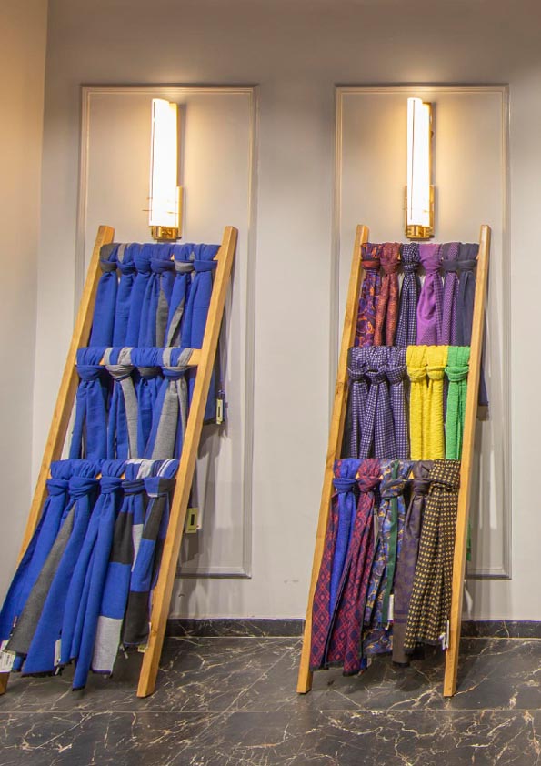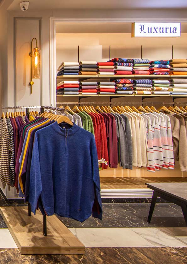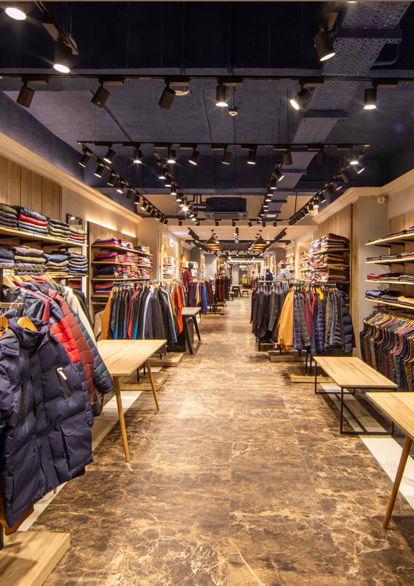 Daylight and artificial lighting provide the ground floor lighting. Simple architectural track-mounted spotlights accent the merchandise. The luminaire takes a number of different lamp types and attachments to achieve all the required lighting effects whilst maintaining a coherent scheme.