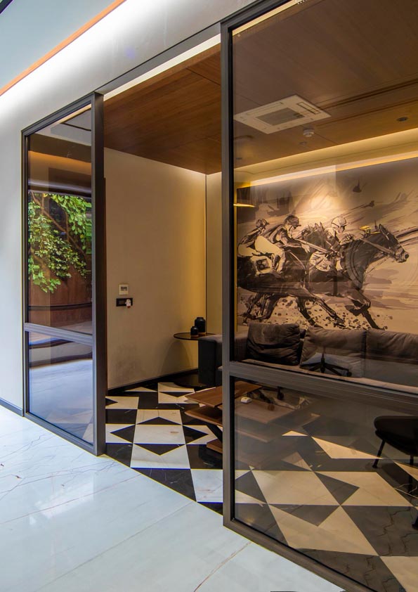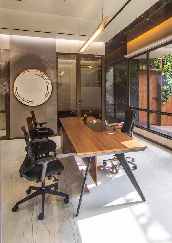 The office sits in an industrial neighbourhood and is lit in layers such that each new space reveals itself. The textures are carefully revealed with a wash of light from above using recessed grazers and spots at the top.